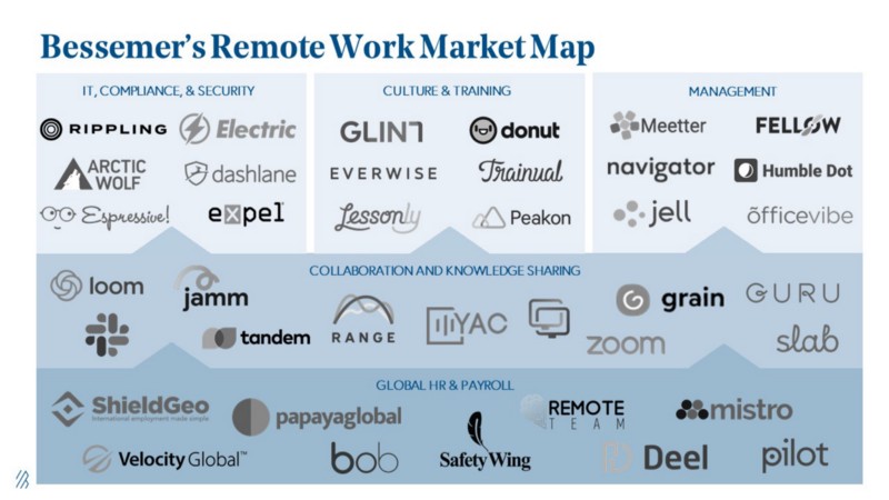 Building a strong and deliberate culture is a challenge for all companies. While culture is not defined by physical space, distributed teams need to create new playbooks to infuse their flavor into everyday interactions. Likewise, remote workers often cite loneliness as one of the biggest obstacles. There is an opportunity for software to bring serendipitous “water-cooler-talk” and “team-building” activities to a distributed environment. Bessemer portfolio company Glint (acquired by LinkedIn), provides employee engagement solutions to help companies stay abreast of worker satisfaction, development, and culture.