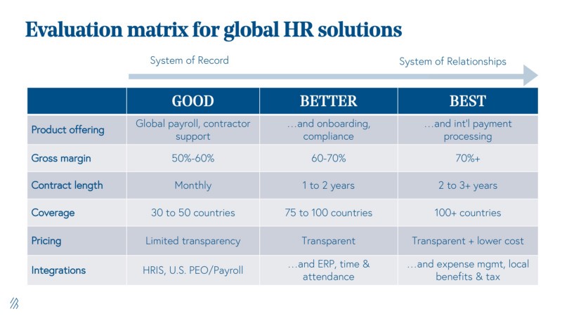 The good news is that there are new systems being built from the ground up with the distributed workforce in mind. Bessemer’s portfolio company Papaya Global is one example. Papaya is a global payroll and workforce management platform that streamlines and automates payroll across 100+ countries for all worker types. It is one of the few truly technology-driven global payroll solutions on the market. We have our eyes open for companies pursuing other segments of the global HR & benefits market for modern teams.