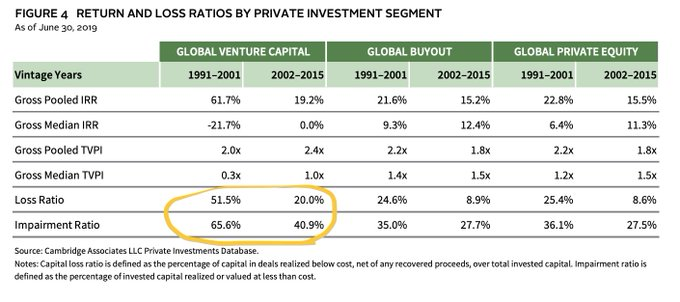 I was surprised this loss rate is only 2x more than buyouts given VC backed companies often have cash burn and are riskier, albeit with asymmetric upside!