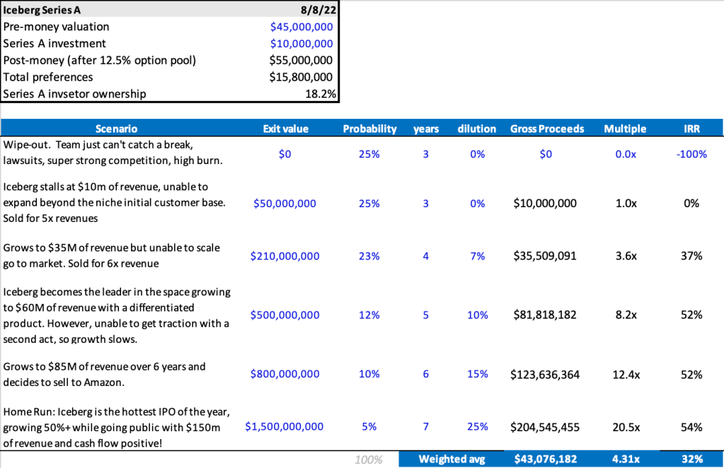 The ideal way to create “reasonable” assumptions is to compare the distribution of returns and outcomes to your actual portfolio or a dataset of similar venture outcomes. What % of deals at this stage are total wipeouts? If the answer is 33%, then adjust the wipeout probability to 33%. What % are at least 10x? Is this company’s potential is better or worse? If so, adjust accordingly.