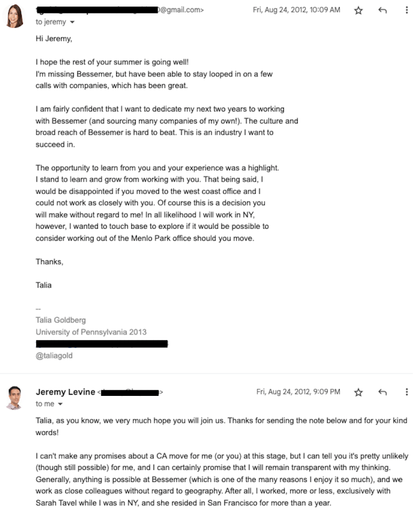 Just over ten years ago, I completed a summer internship at Bessemer. As I considered the return offer, I learned you were contemplating a move to the west coast. I had only one question about the offer – should you move, could I go with you?