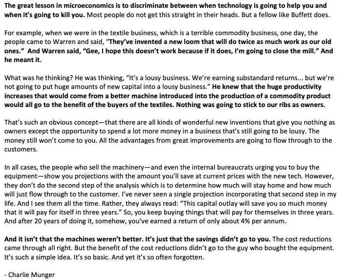 This dynamic reminds me of a favorite Charlie Munger story, where he explains how certain technology innovations results in consumer surplus. Investors beware.